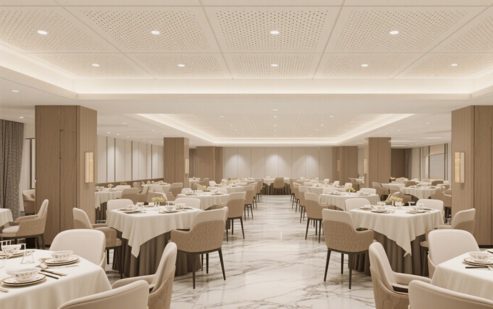 Equilibrar el ambiente social y la comodidad en la cena, aumentando la rotación de mesas en un 20%. Adoptar un diseño de techo y mamparas insonorizantes.