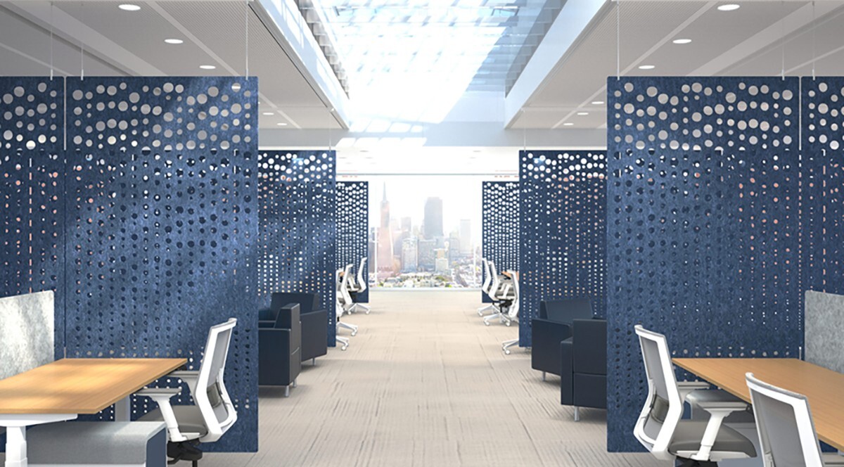 El PET (tereftalato de polietileno) es un material ligero, suave y similar al fieltro, fabricado con plásticos 100 % reciclados, como el de las botellas de refrescos o agua. En lugar de acabar en vertederos o en nuestros océanos, los plásticos de estos productos se transforman en paneles de 12 mm de grosor de diferentes colores. Estos paneles se cortan en formas y tamaños personalizados para reducir la contaminación acústica y las distracciones molestas en la oficina. El material fonoabsorbente de nuestros paneles para techos acústicos es extremadamente eficaz para reducir el ruido ambiental. Tiene un coeficiente de reducción de ruido (NRC) de 0,75, lo que equivale aproximadamente al 75 % del ruido de altos decibelios. El PET no produce emisiones nocivas, no desprende olor ni es inflamable. De hecho, la ASTM le otorga una clasificación de resistencia al fuego E-84 CLASE A. Esta clasificación es la más segura que pueden tener los paneles para techos acústicos. No solo son duraderos, sino que también son fáciles de limpiar y desinfectar.